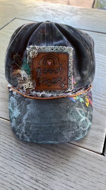 Spread positivity and style with this boho-inspired hat, featuring a hand-burned leather patch that reads “Good Vibes.” Adorned with feathers and upcycled metal jewelry pieces, this hat is a unique blend of eco-consciousness and creativity. The brim showcases a hand painted design with metallic foil accents, giving it a vibrant and artistic touch.